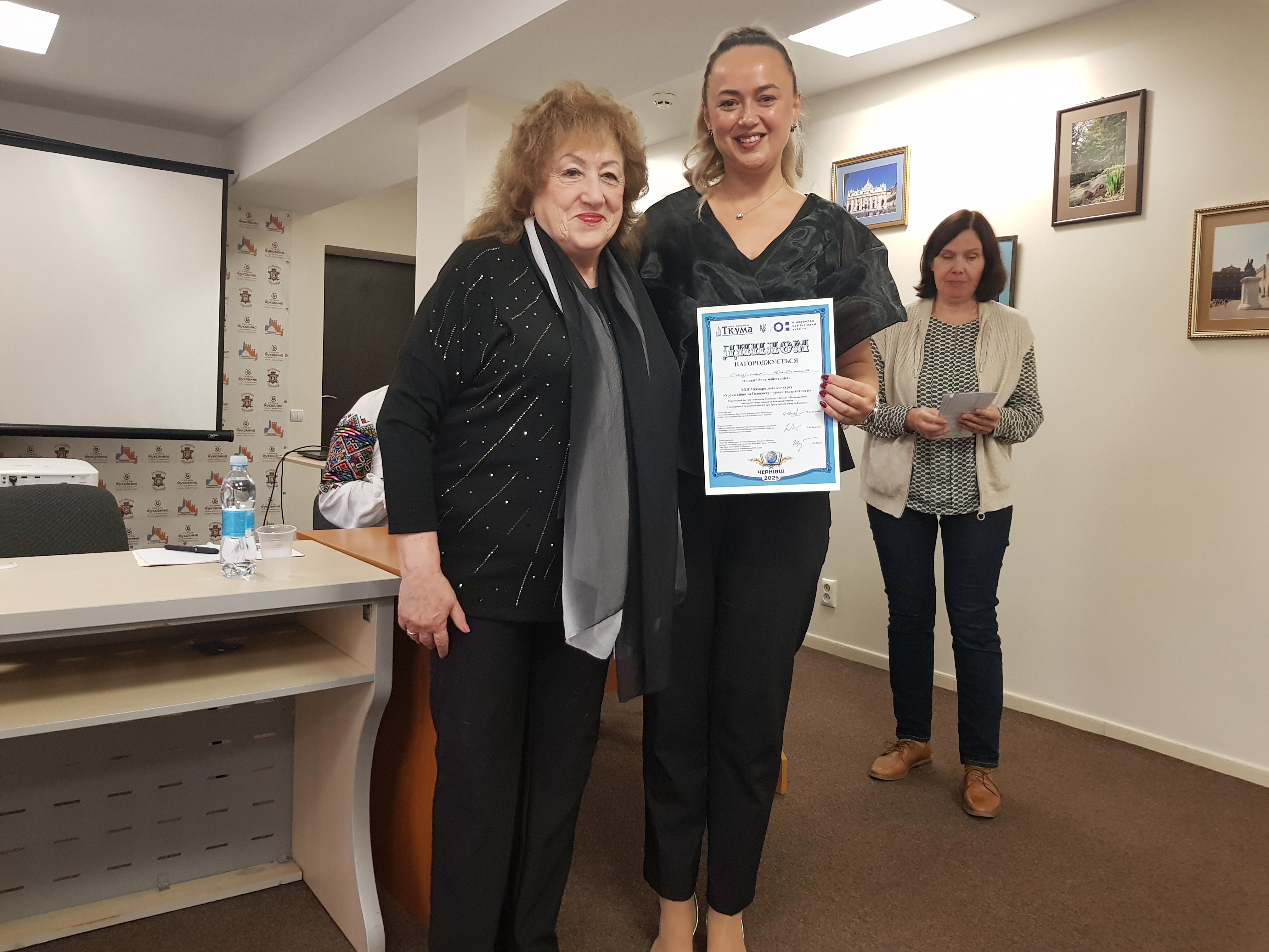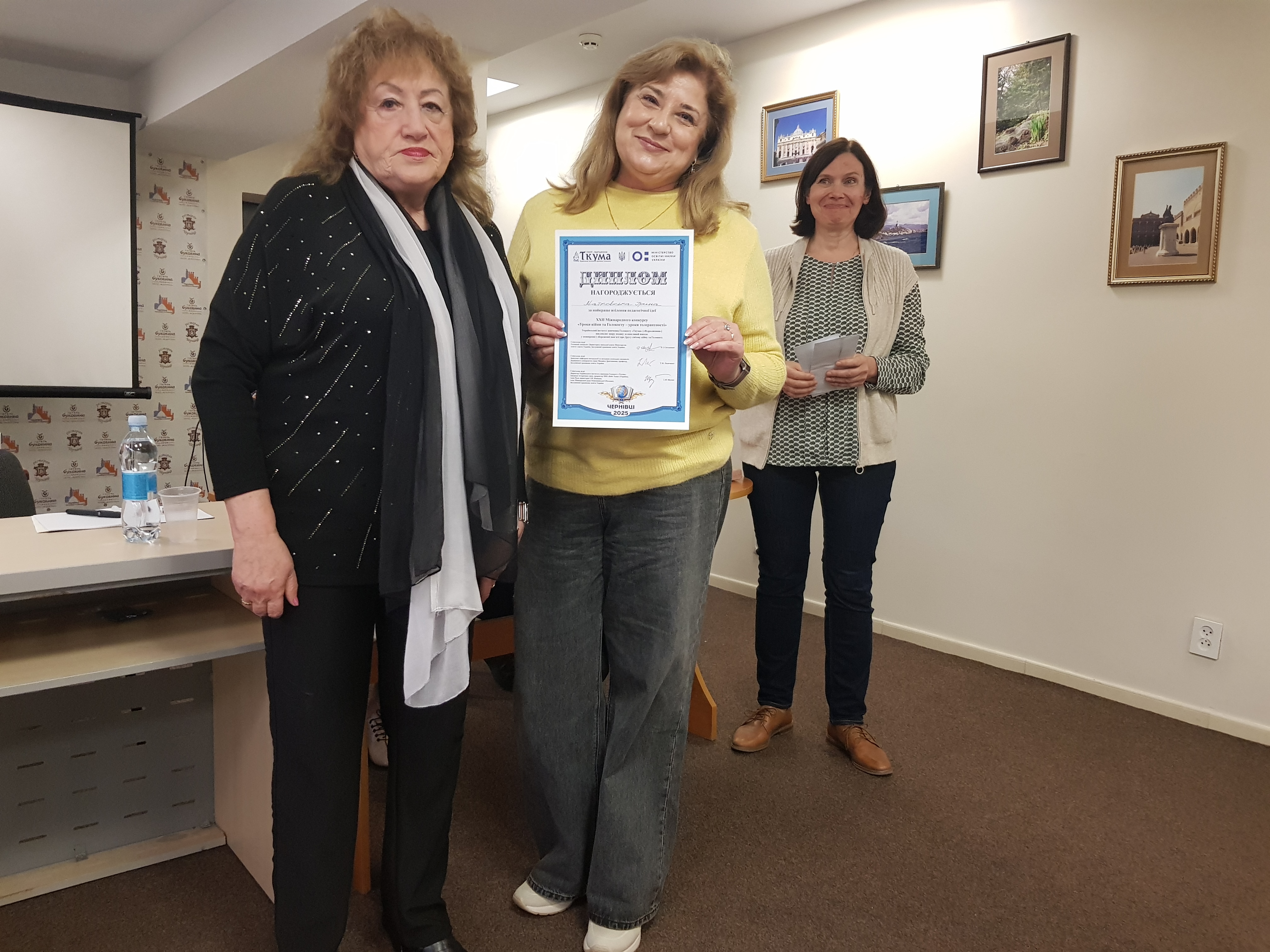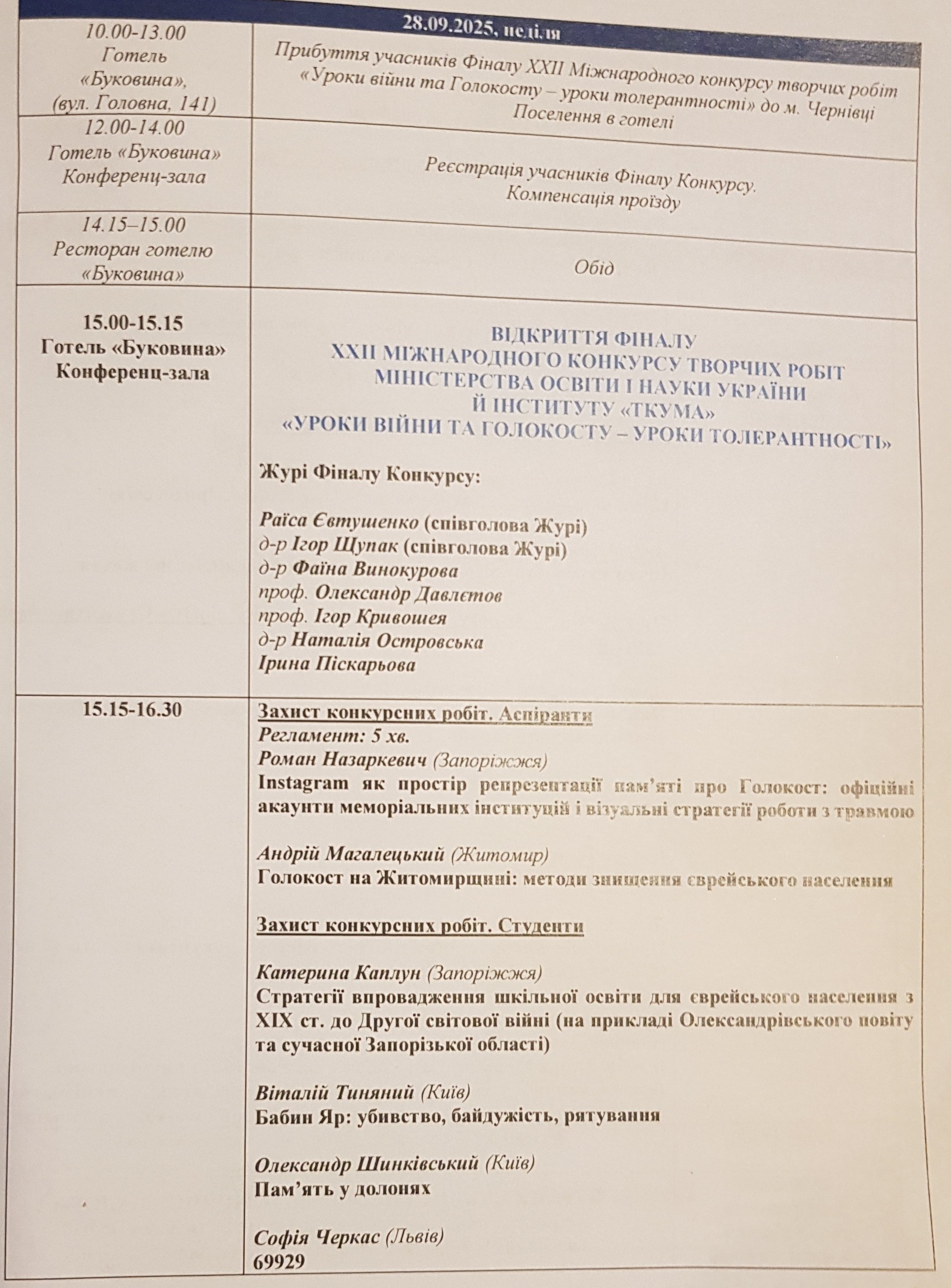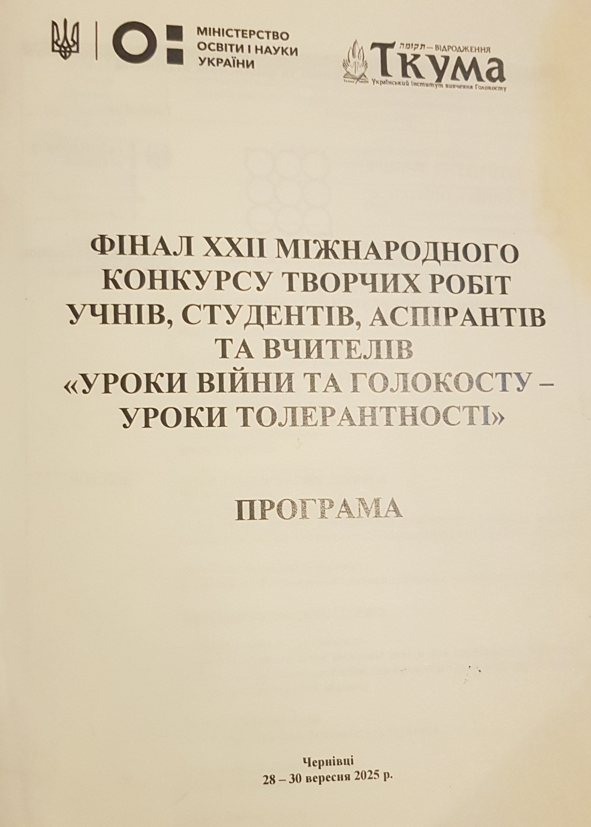 28-30 вересня 2025 року у Чернівцях (готель «Буковина») тривав фінал ХХІІ міжнародного конкурсу творчих робіт учнів, студентів, аспірантів та вчителів «Уроки війни та Голокосту – уроки толерантності», організований Міністерством освіти і науки України та Українським інститутом вивчення Голокосту «Ткума» (Відродження). Серед його учасників були представники Ізраїлю, Канади , 15 областей України, у тому числі тих, де відбуваються бойові дії сучасної війни.